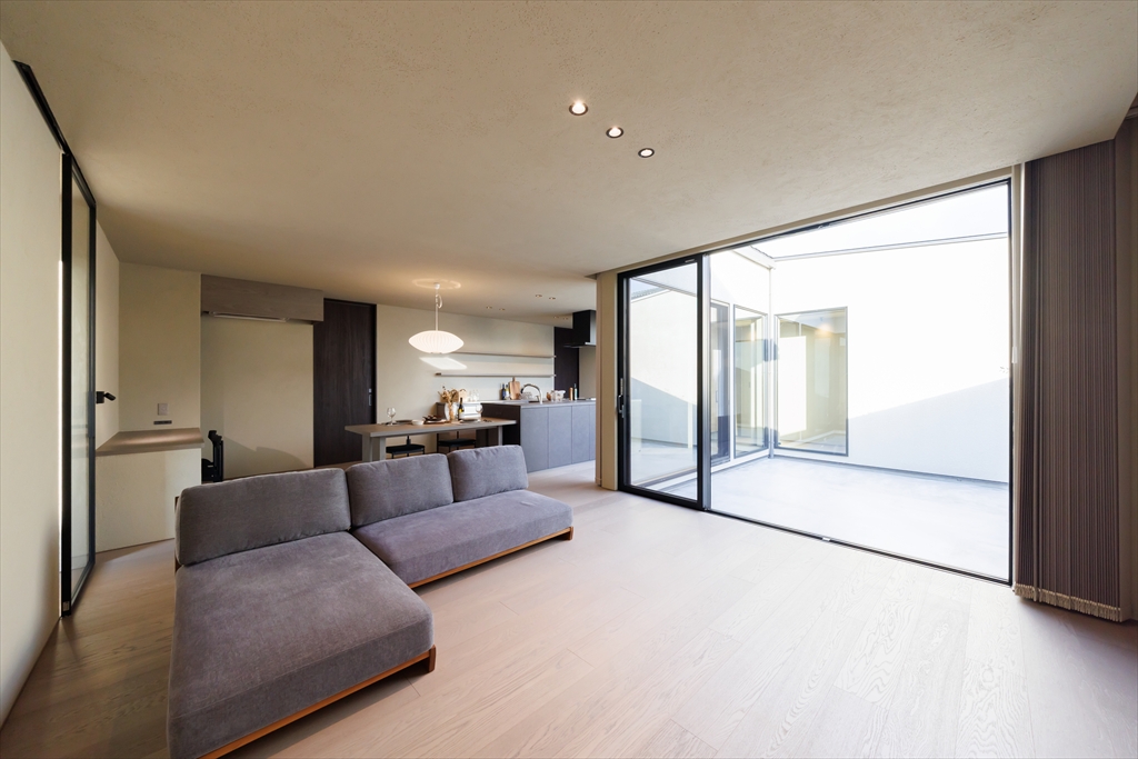 南東に開けたテラスを囲んだ、光あふれるコートハウス。