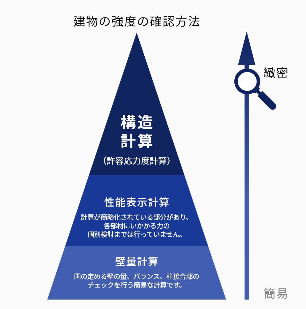 この計算方法で、3段階あるもっとも強度の高い耐震等級3を確保しています。