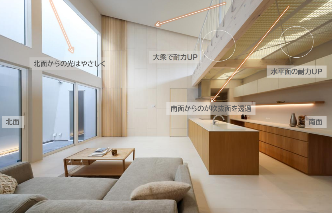 耐震強度をあげていくと、柱や壁がたくさん必要になり、大きな空間を創りにくくなりますが、呉羽モデルでは21.5帖のリビングに柱を立てることなく大きな吹抜を実現しています。