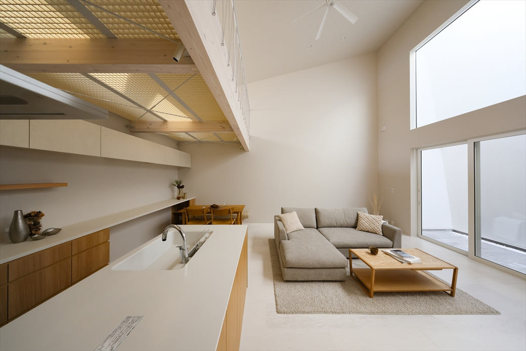今回の呉羽モデルでは、キッチン~ダイニングの上部を格子状の特殊な床を活用し、水平面の強度を創り出し、空間全体の強度を確保しています。