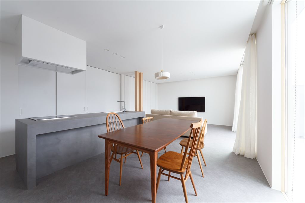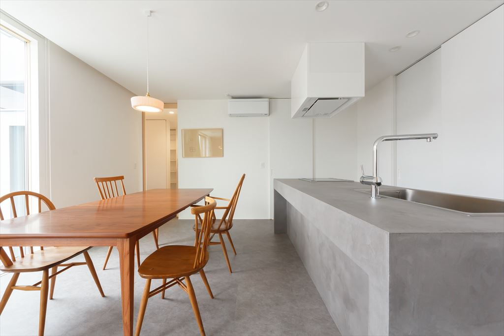 さらに同じグレーの部分でも、キッチン本体がモールテックスで造作仕上げとなっており、素材感の違いがしっかり出ています。