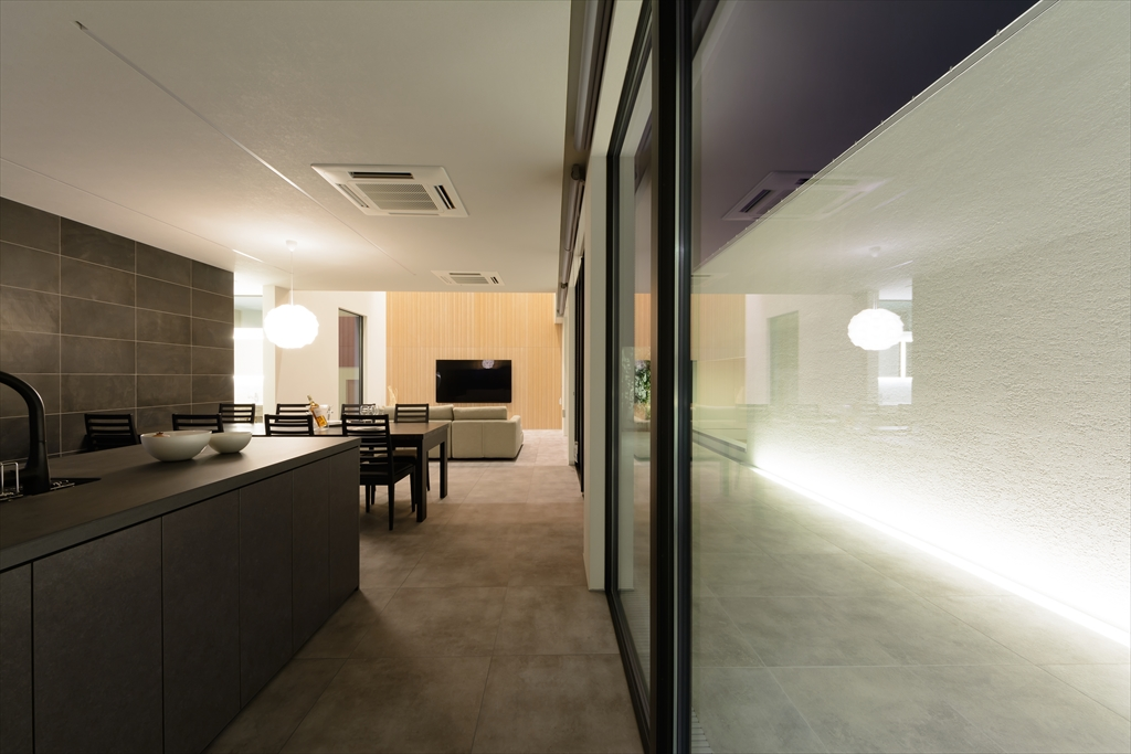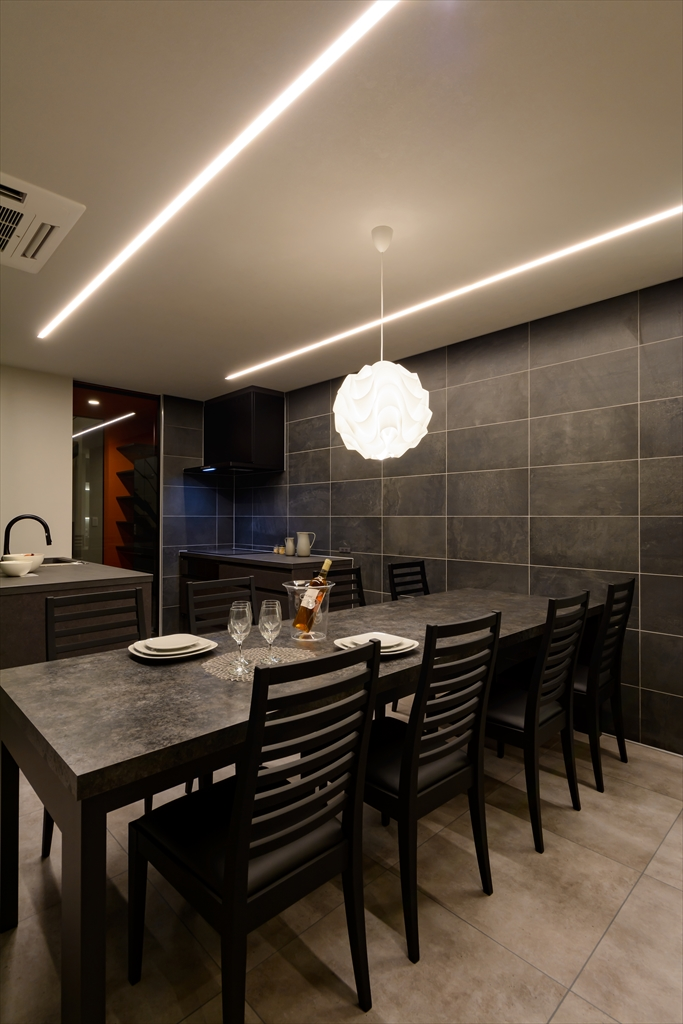 さらに、キッチン~ダイニングテーブルの上部には埋め込んだライン照明が印象的です。