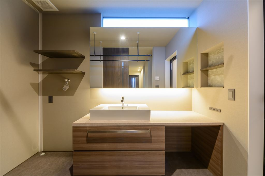 こちらの事例のように、鏡の上下や背面に間接照明を仕込むことで、壁面に柔らかな光が広がり、ホテルのパウダールームのような落ち着いた雰囲気を演出できます。