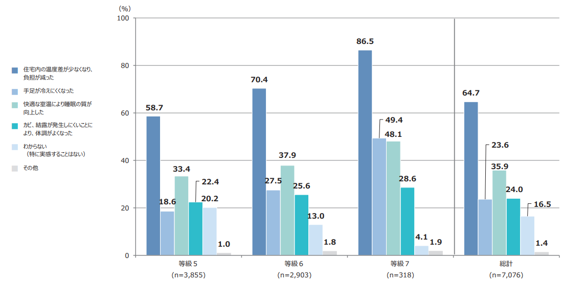 ただ、ZEH相当の等級5であったとしても、6割近い方が満足している実態と、最高等級の7でも約8割超なっており「約2割の方が差を感じている」と言い換えることできるでしょうか。