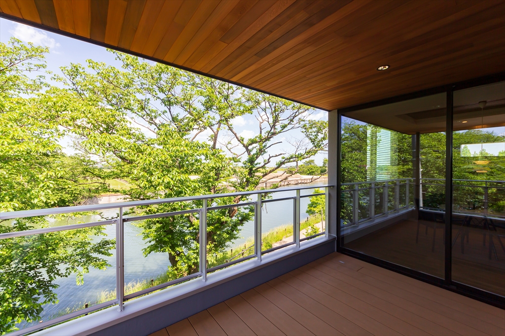 運河の水面と桜並木、立山連峰が見える立地を最大限に活かした2階リビングの住まい。