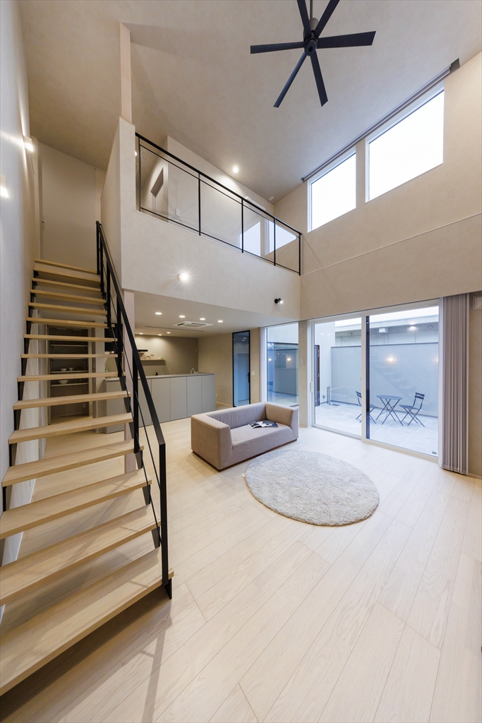 リビング階段と2Fホールが、憩いの空間にプラスαのゆとりを生み出す。